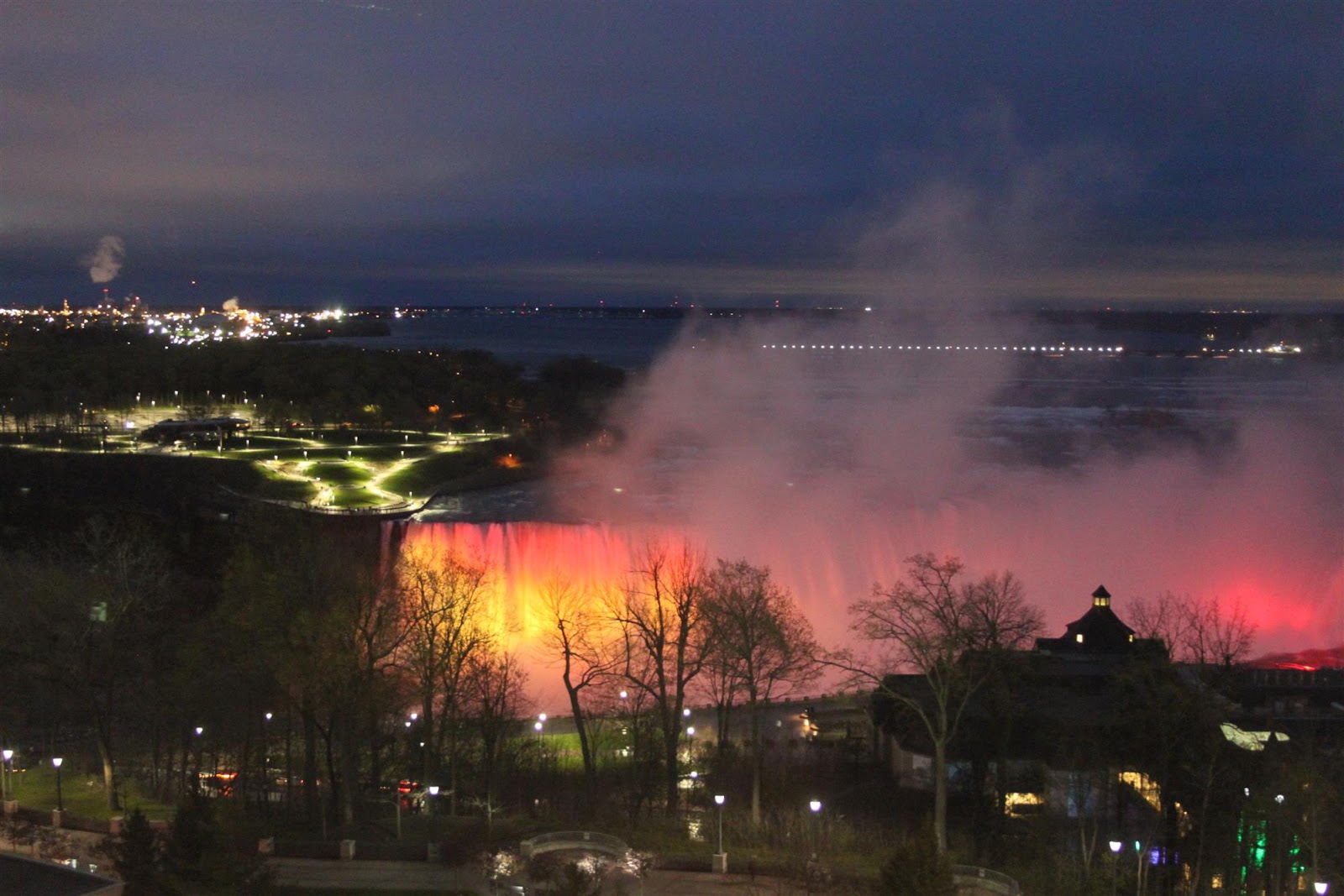 Na een korte nacht, als gevolg van jetlag, gaan we om half 8 ontbijten. Daarna zet ik de route naar Niagara Falls in de gps en rijden we daarna naar een Walmart in de buurt om in ieder geval een verloopstekker (usa en europa) te bemachtigen. Die kunnen we daar niet vinden, ook de medewerkers weten het niet. Het is zondag vandaag, dus ook niet alle winkels zijn open. We besluiten om dus maar gewoon naar Niagara Falls te rijden. We rijden niet over de snelwegen, Leo houdt van autorijden en vindt de provinciale wegen veel relaxter rijden, je komt door kleine stadjes en kunt alles net wat beter bekijken omdat je langzamer rijdt. Na een korte fotostop aan Lake Ontario, want het regent en het is best koud, rijden we door naar ons doel voor vandaag. We checken in bij het Oakes hotel Overlooking the Falls en gaan naar onze kamer. Daar zijn we heel blij met het uitzicht wat we hebben over de watervallen. We besluiten om om buiten te gaan lopen en te gaan zien wat we willen zien. We lopen eerst hoog langs een pad waar we mooie uitzichten hebben. Dan lopen we door het lunapark dat de Canadezen aan deze kant van de rivier hebben aangelegd, er is van alles te doen. Ook kun je je geld verliezen in verschillende casino's, maar dat doen we niet. Het is goed koud, er staat een koude wind en het regent een beetje. Wij hebben geen extra truien en geen jassen, want die zitten in de koffers.